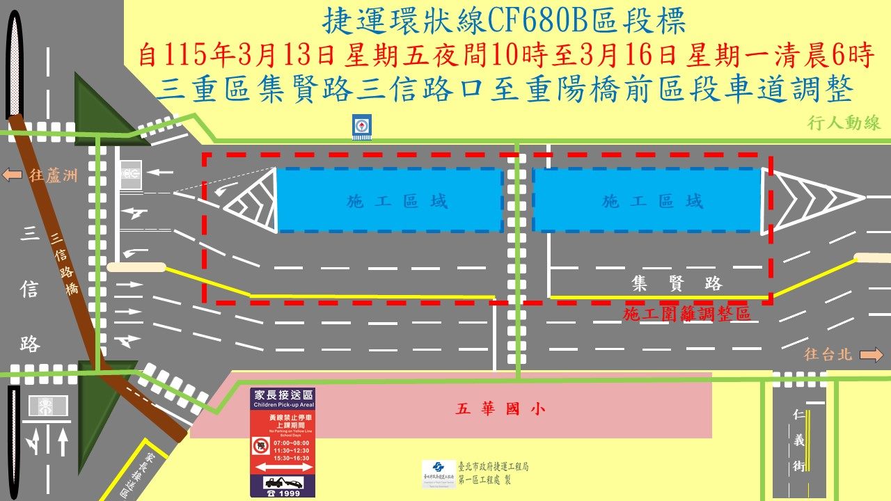 施工單位將自115年3月13日星期五夜間10時至3月16日星期一清晨6時於三重區集賢路三信路口至重陽橋前區段進行施工圍籬、標誌線及號誌燈調整。 屆時請用路人行經該路段時依改道後之宣導牌面、遵循導引標誌及現場指揮人員指示減速慢行,以確保您的行車安全。施工期間民眾如有任何問題及建議事項,或想瞭解最新施工動態,可隨時利用下列聯絡電話反映,將有專人竭誠為您服務與解說,施工所造成之暫時不便,敬請見諒。