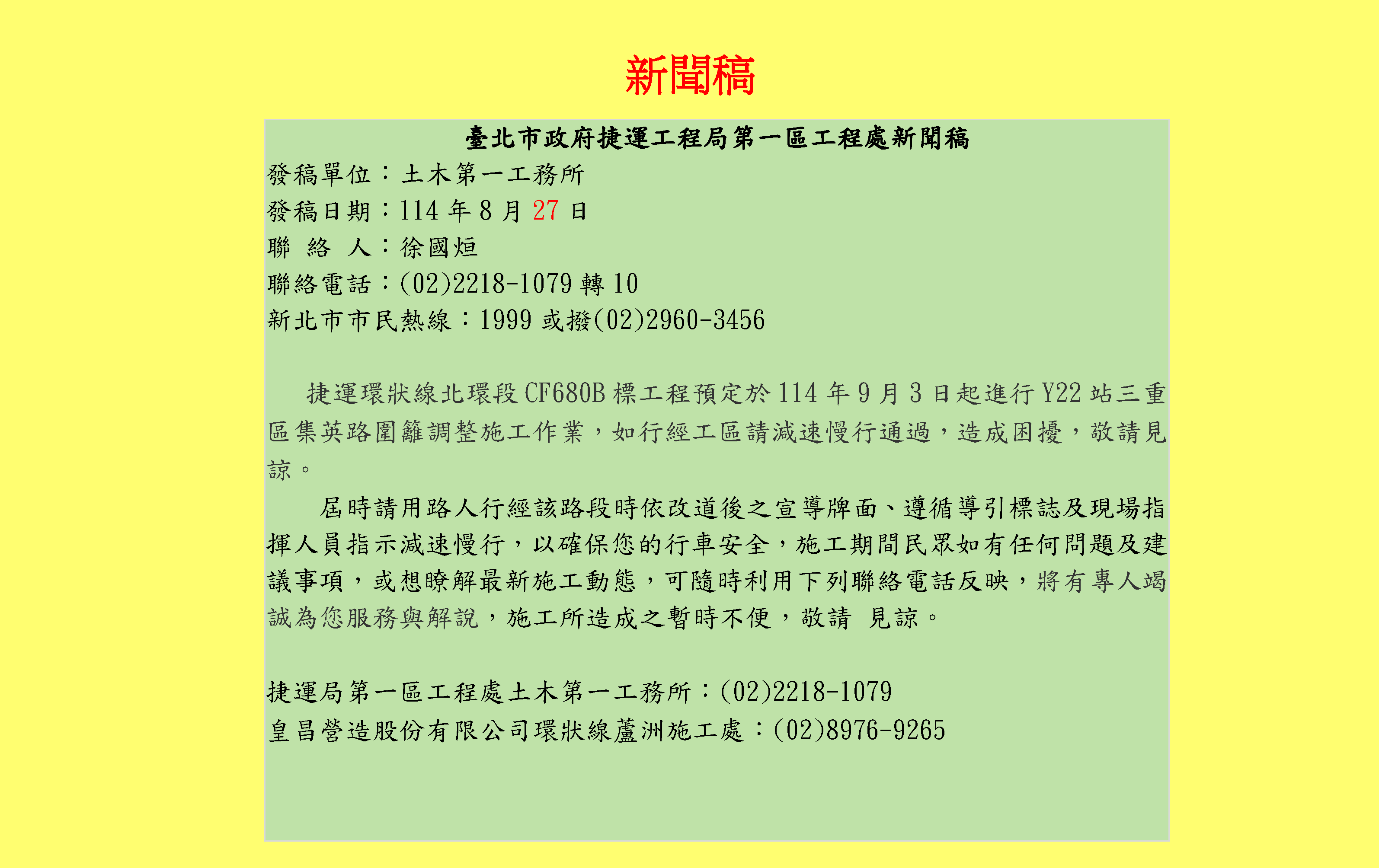 捷運局第一區工程處服務專線(02)2896-9633