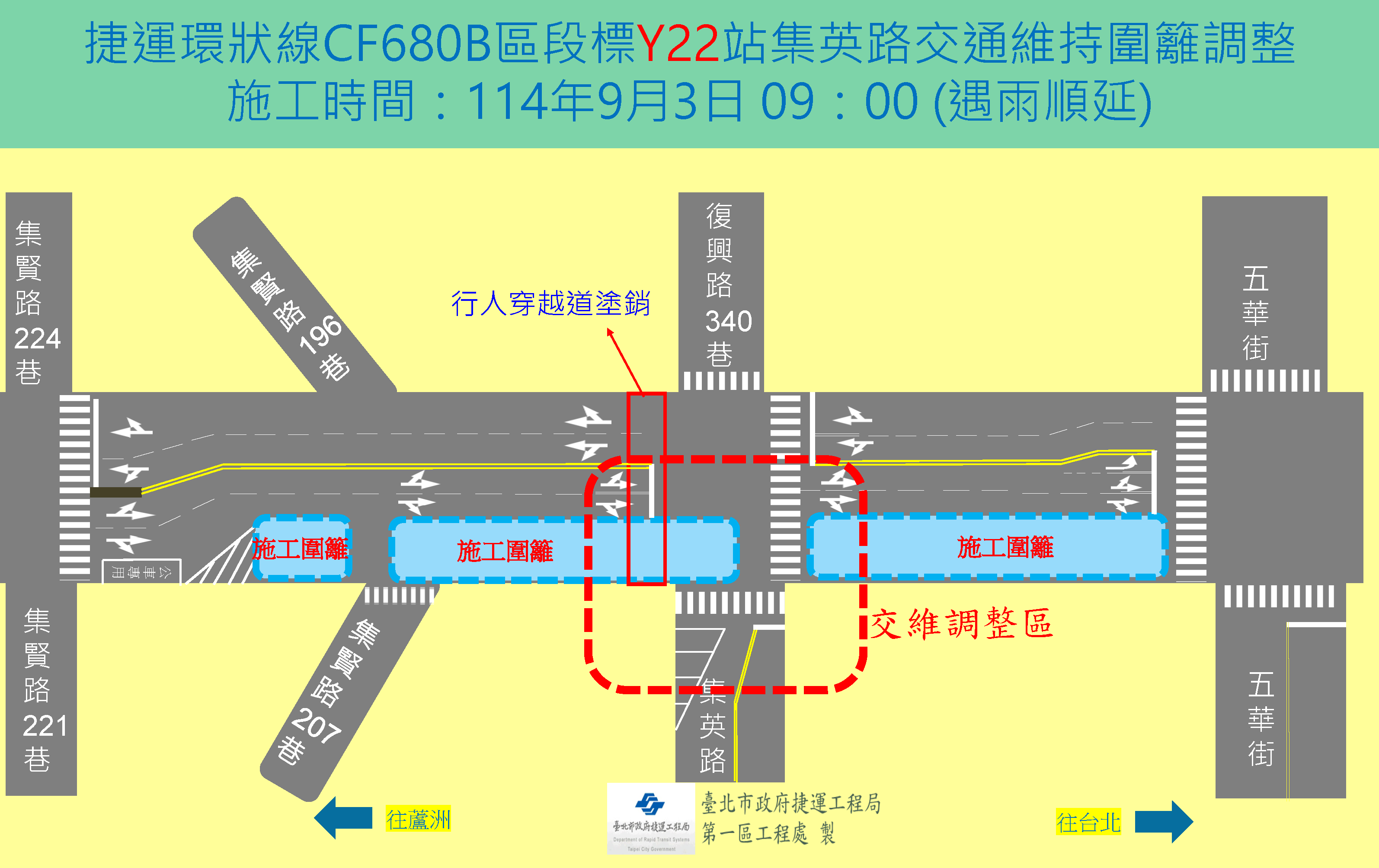 施工單位將自114年9月3日起開始進行三重區集賢路與集英路口施工圍籬架設調整、淺層開挖、覆工板及管線吊掛等相關施工作業,施工範圍,如附圖。 施工作業期間請用路人行經施工區域減速慢行,並依改道後之宣導牌面、遵循導引標誌及現場指揮人員導引指示減速慢行,以確保行車安全。施工期間民眾如有任何問題以及建議事項,或想瞭解最新施工動態,可隨時利用下列聯絡電話反映,將有專人竭誠為您服務與解說,施工造成暫時不便,敬請見諒。