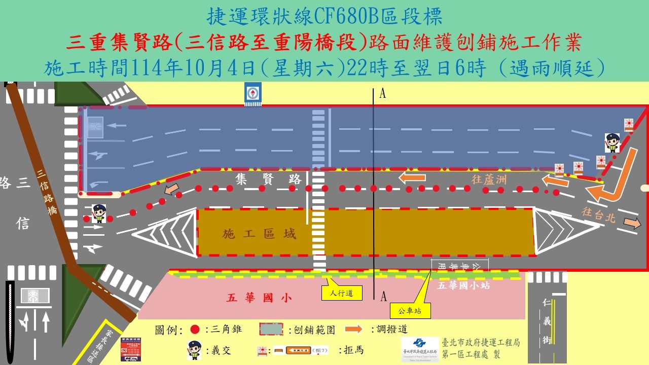 施工單位將自114年10月4日(六)至5日(日)每日夜間22時至翌日6時,進行Y23站三重區集賢路(三信路至重陽橋段)路面維護刨舖施工作業,遇雨將擇日再施工,施工範圍如附圖。 施工作業期間請用路人行經施工區域減速慢行,並依改道後之宣導牌面、遵循導引標誌及現場指揮人員導引指示減速慢行,以確保行車安全。施工期間民眾如有任何問題以及建議事項,或想瞭解最新施工動態,可隨時利用下列聯絡電話反映,將有專人竭誠為您服務與解說,施工造成暫時不便,敬請見諒。