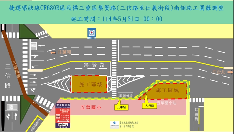 施工單位將自114年5月31日開始進行三重區集賢路 (三信路至仁義街間)車站區南側施工圍籬架設調整、中間樁及地質改良等相關施工作業,施工範圍如附圖。 施工作業期間請用路人行經施工區域減速慢行,並依改道後之宣導牌面、遵循導引標誌及現場指揮人員導引指示減速慢行,以確保行車安全。施工期間民眾如有任何問題以及建議事項,或想瞭解最新施工動態,可隨時利用下列聯絡電話反映,將有專人竭誠為您服務與解說,施工造成暫時不便,敬請見諒。