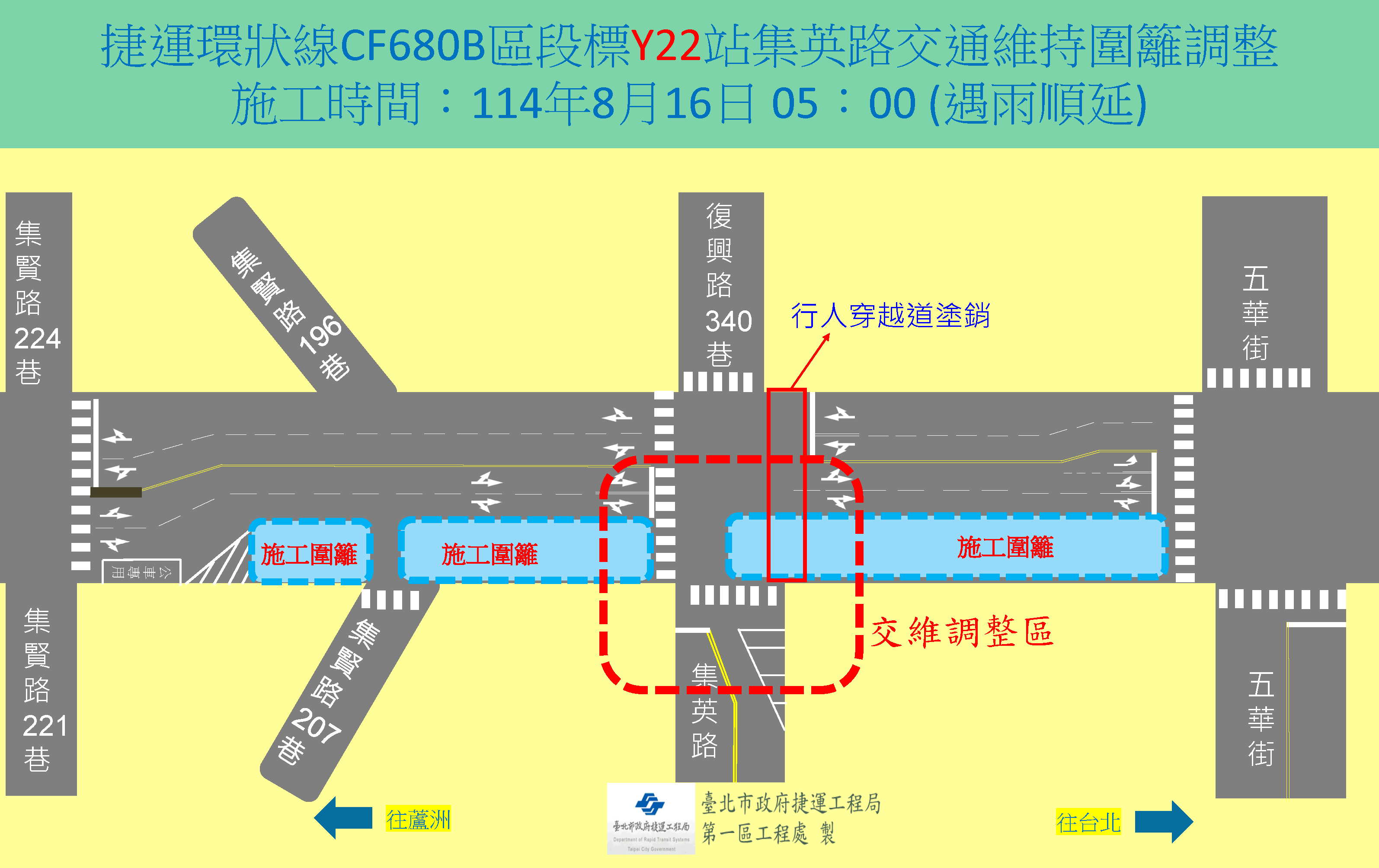 施工單位將自114年8月16日(六)上午05:00至12:00,進行Y22站集賢路與集英路路口交通維持圍籬調整施工作業,遇雨順延,施工範圍如附圖。施工作業期間請用路人行經該路段時依改道後之宣導牌面、遵循導引標誌及現場指揮人員指示減速慢行,以確保您的行車安全。施工期間民眾如有任何問題及建議事項,或想瞭解最新施工動態,可隨時利用下列聯絡電話反映,將有專人竭誠為您服務與解說,施工所造成之暫時不便,敬請見諒。