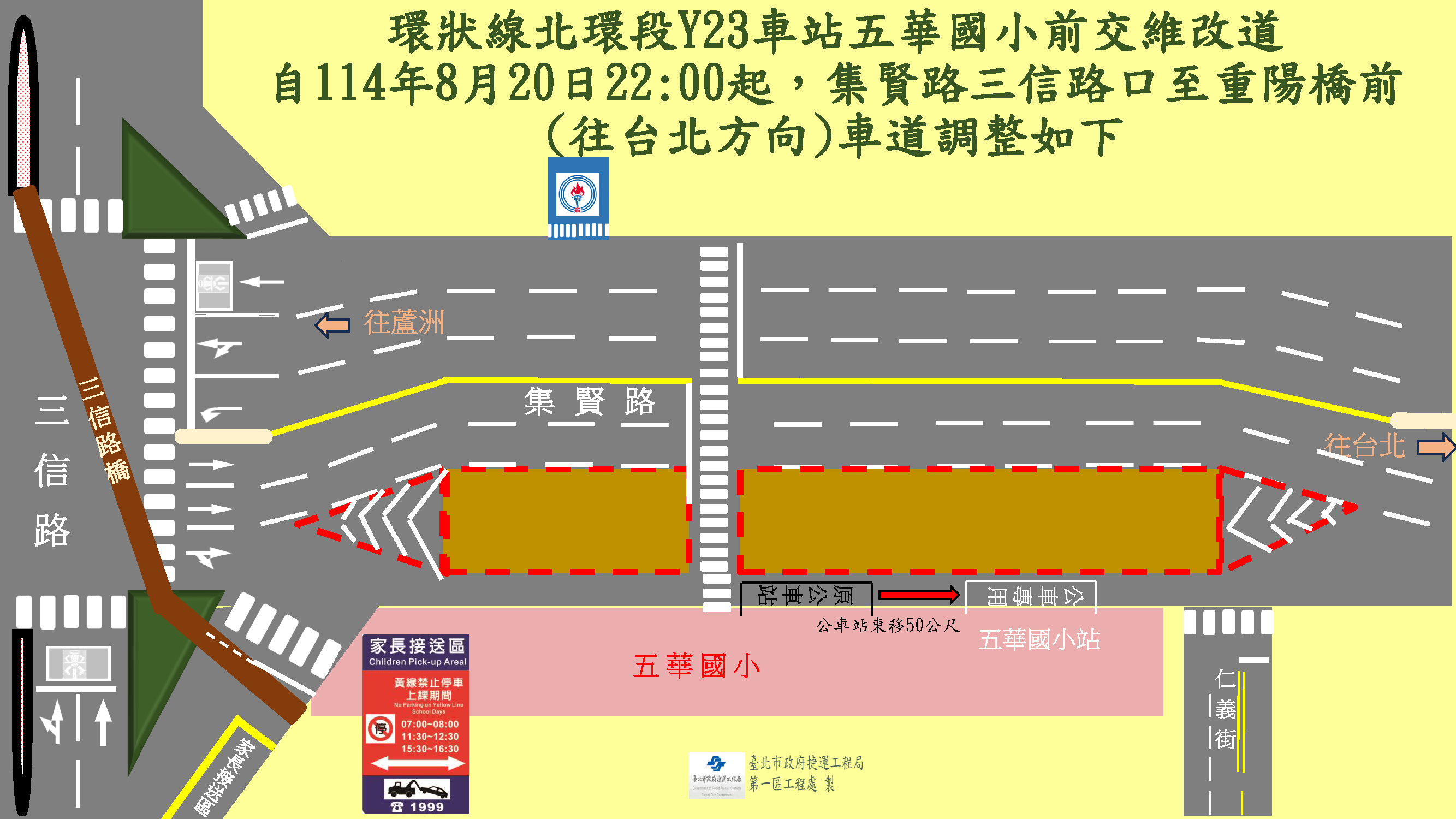 施工單位將自114年8月20日22:00至8月21日06:00於三重區集賢路三信路口至重陽橋前(往台北方向)進行施工圍籬、標誌線、號誌燈調整及公車站移設,公車站牌遷移地點如附圖,請欲搭乘之民眾移動至新移設站牌處搭乘公車。 屆時請用路人行經該路段時依改道後之宣導牌面、遵循導引標誌及現場指揮人員指示減速慢行,以確保您的行車安全。施工期間民眾如有任何問題及建議事項,或想瞭解最新施工動態,可隨時利用下列聯絡電話反映,將有專人竭誠為您服務與解說,施工所造成之暫時不便,敬請 見諒。
