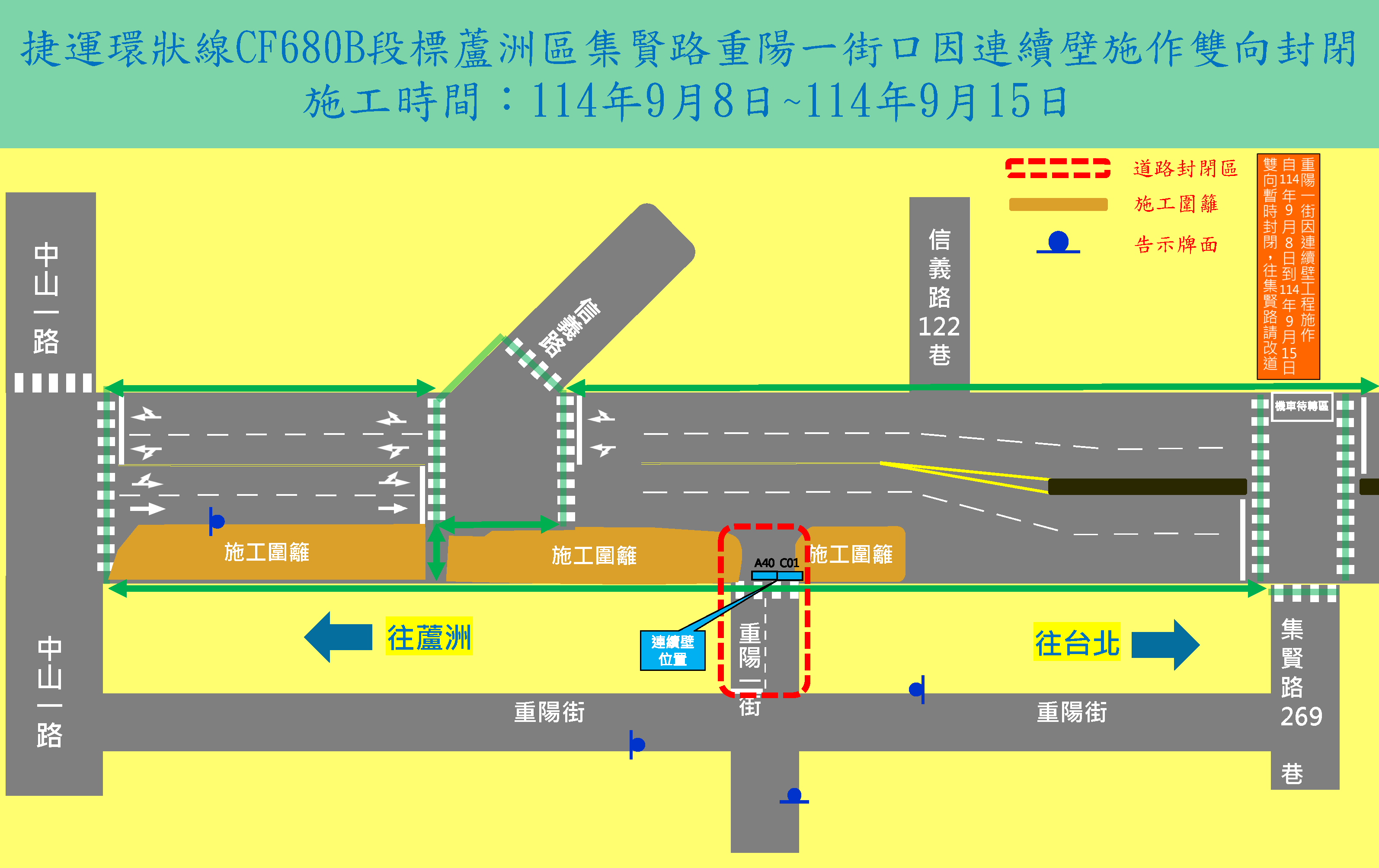 施工單位將自114年9月8日至9月15日於蘆洲區集賢路與重陽一街口進行施工圍籬調整及連續壁等相關施工作業,並暫時性封閉重陽一街(集賢路至重陽街間)道路,施工範圍如附圖。 施工作業期間請用路人行經施工區域減速慢行,並依改道後之宣導牌面、遵循導引標誌及現場指揮人員導引指示減速慢行,以確保行車安全。施工期間民眾如有任何問題以及建議事項,或想瞭解最新施工動態,可隨時利用下列聯絡電話反映,將有專人竭誠為您服務與解說,施工造成暫時不便,敬請見諒。