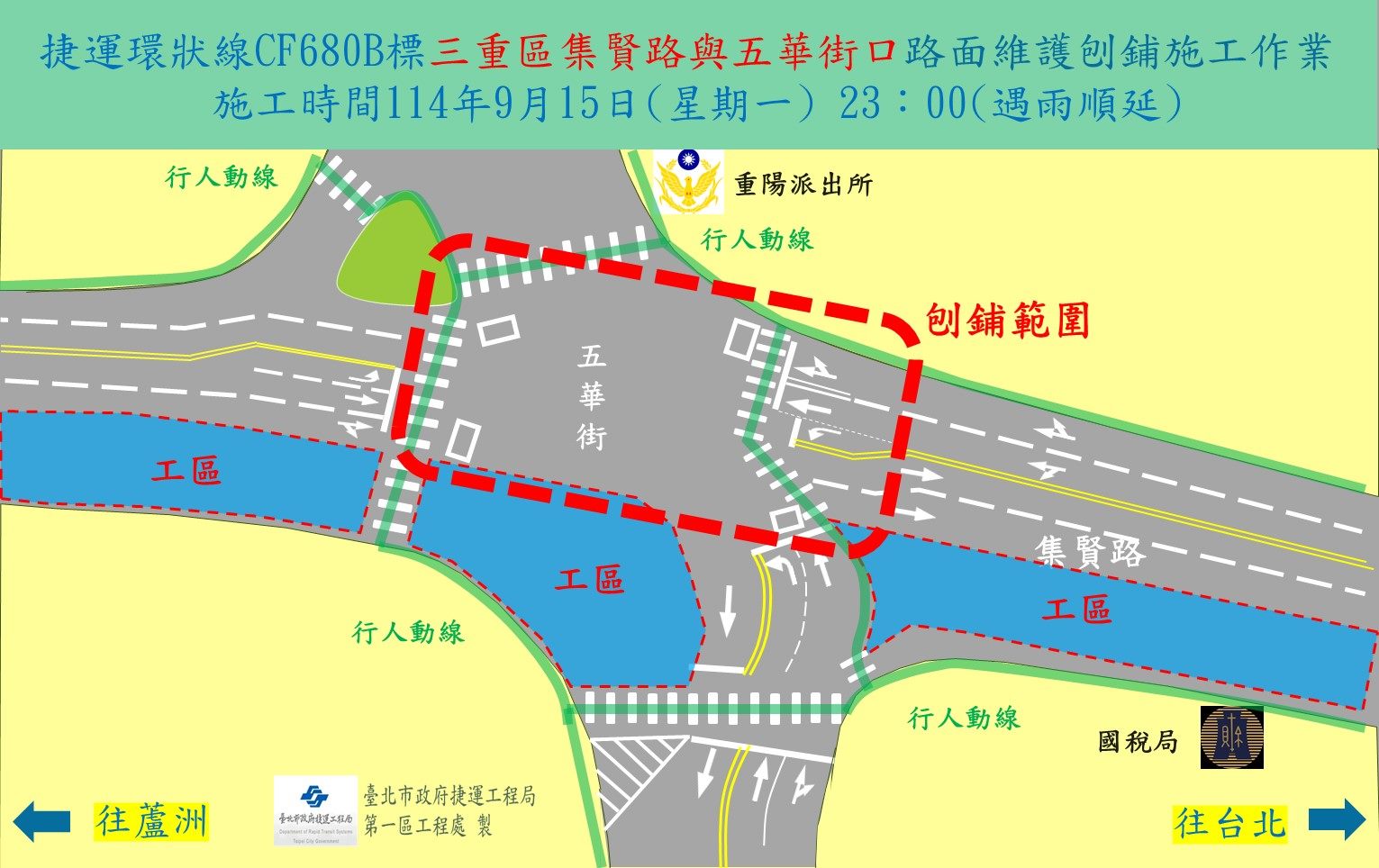 施工單位將自114年9月15日(一)夜間23時起,進行Y22站三重區集賢路與五華街路口路面維護刨舖施工作業,遇雨將擇日再施工,施工範圍如附圖。 施工作業期間請用路人行經施工區域減速慢行,並依改道後之宣導牌面、遵循導引標誌及現場指揮人員導引指示減速慢行,以確保行車安全。施工期間民眾如有任何問題以及建議事項,或想瞭解最新施工動態,可隨時利用下列聯絡電話反映,將有專人竭誠為您服務與解說,施工造成暫時不便,敬請見諒。