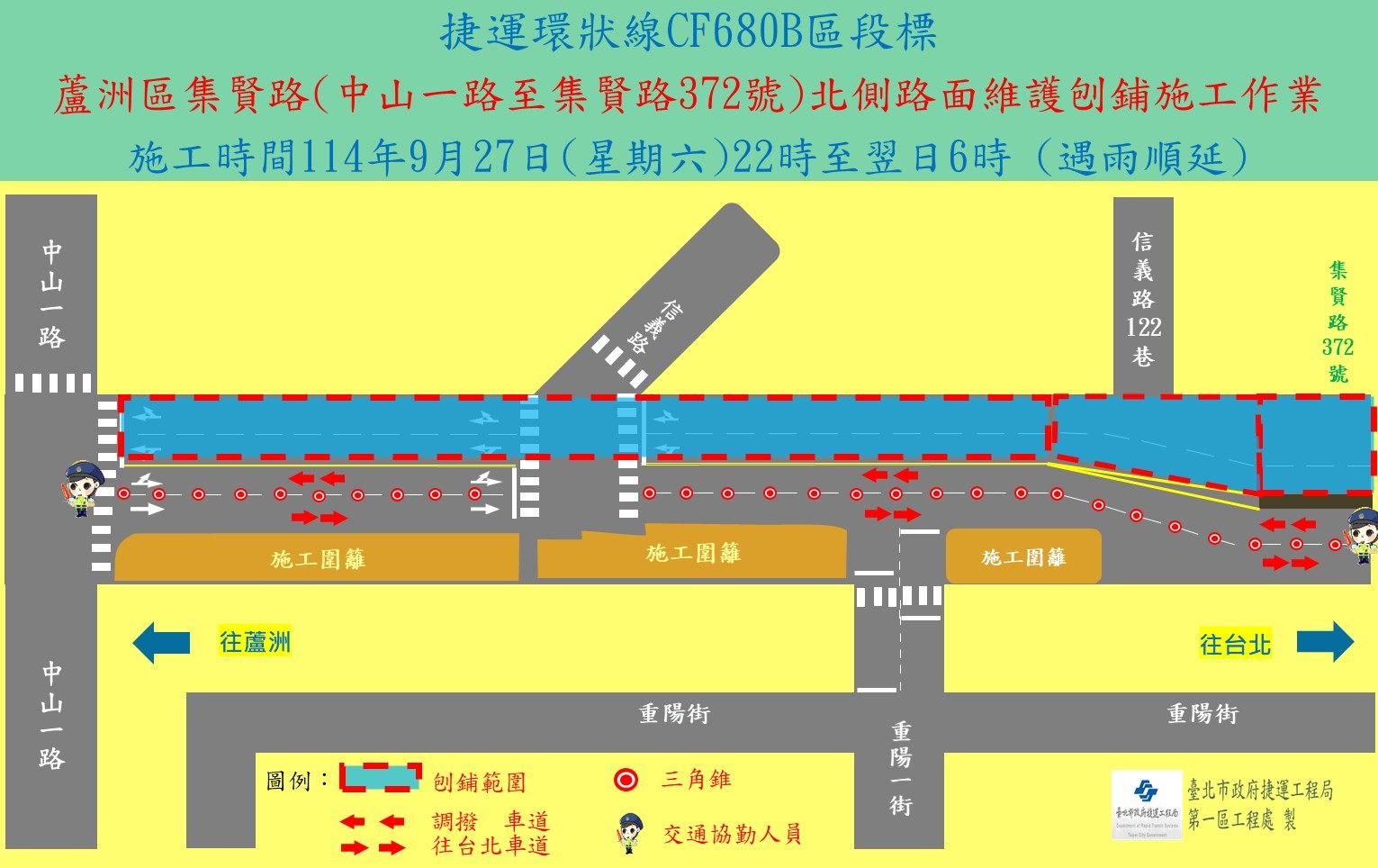 施工單位將自114年9月27日(六)夜間22時起,進行Y21站蘆洲區集賢路(中山一路至集賢路372號段)北側路面維護刨舖施工作業,遇雨將擇日再施工,施工範圍如附圖。 施工作業期間請用路人行經施工區域減速慢行,並依改道後之宣導牌面、遵循導引標誌及現場指揮人員導引指示減速慢行,以確保行車安全。施工期間民眾如有任何問題以及建議事項,或想瞭解最新施工動態,可隨時利用下列聯絡電話反映,將有專人竭誠為您服務與解說,施工造成暫時不便,敬請見諒。