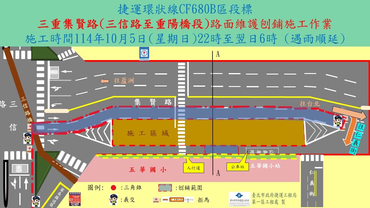 施工單位將自114年10月4日(六)至5日(日)每日夜間22時至翌日6時,進行Y23站三重區集賢路(三信路至重陽橋段)路面維護刨舖施工作業,遇雨將擇日再施工,施工範圍如附圖。 施工作業期間請用路人行經施工區域減速慢行,並依改道後之宣導牌面、遵循導引標誌及現場指揮人員導引指示減速慢行,以確保行車安全。施工期間民眾如有任何問題以及建議事項,或想瞭解最新施工動態,可隨時利用下列聯絡電話反映,將有專人竭誠為您服務與解說,施工造成暫時不便,敬請見諒。