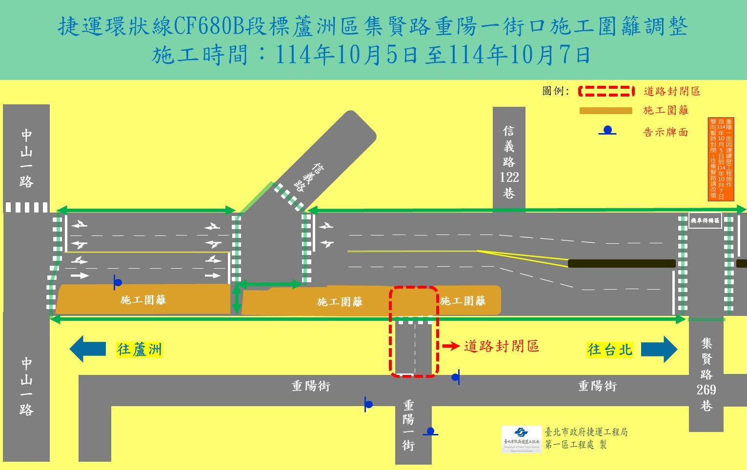 為進行Y21車站連續壁施工,環狀線北環段CF680B標施工單位將自114年10月5日至10月7日於蘆洲區集賢路與重陽一街口進行施工圍籬調整及連續壁等相關作業,並暫時性封閉重陽一街(集賢路至重陽街間)道路,施工範圍如附圖。